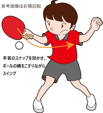 そうすることで、打球に勢いがつき、回転力のある横回転ボールとなります。